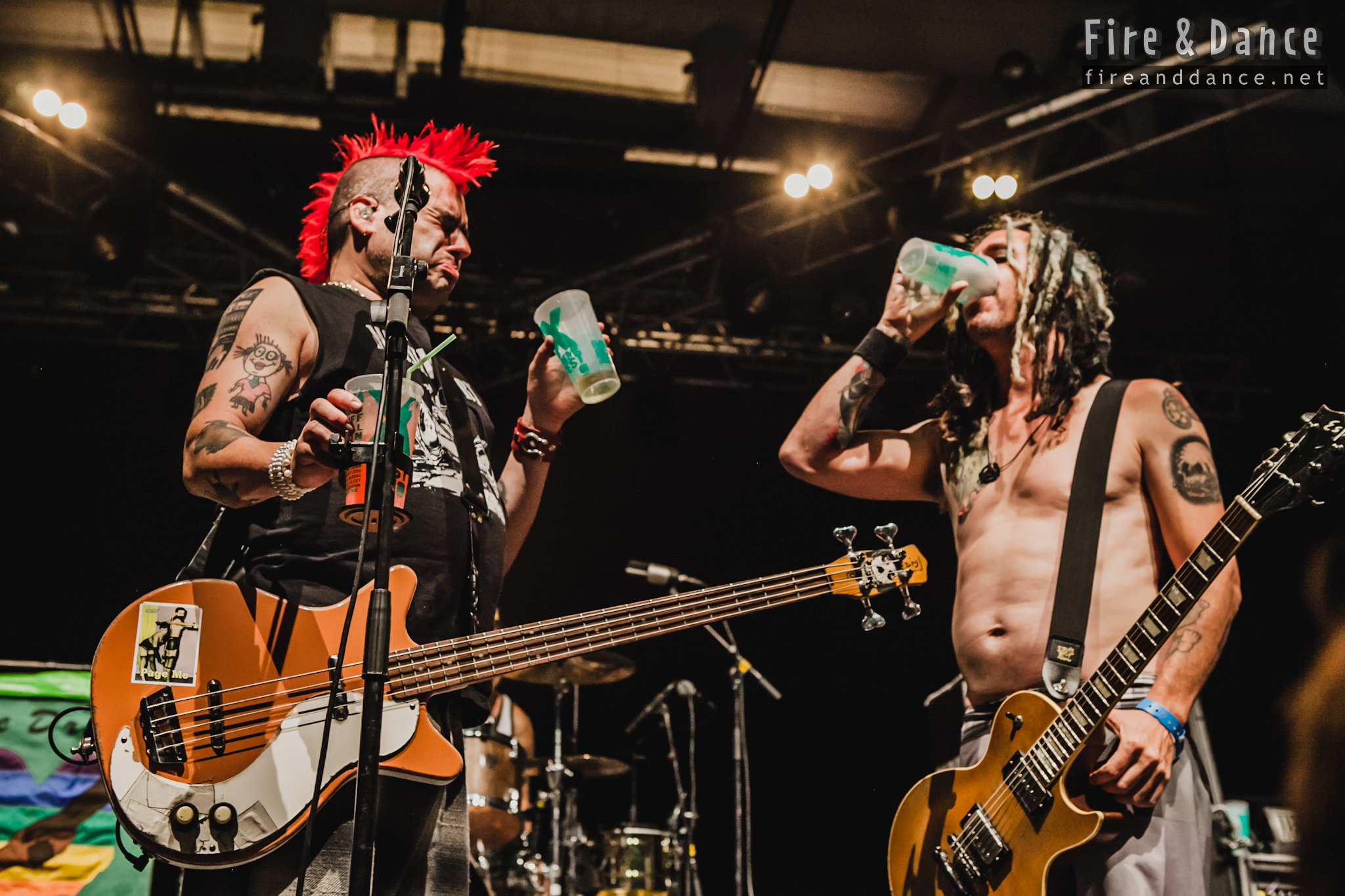 Et ça ne s’arrangera pas puisque son godet ne restera jamais vide bien longtemps. Miraculeusement, dès les premières notes de « 60% » qui ouvre le bal comme de coutume, ça tient la route. Faut dire que les trois autres semblent en meilleur état. Eric Melvin (guitare et dreadlocks) s’adonne même aux sauts de cabri qui le caractérisent. La fête peut donc commencer pour le public. Superbe ambiance au sein d’une foule compacte, en particulier lorsque surgissent les classiques du groupe : « Murder The Government », « Leave It Alone », ou « The Separation Of Church And Skate » (« best NOFX song » nous dit ce farceur de Fat Mike). NOFX est autant un groupe de « punk à roulette » que de « punk à crête », donc tout le monde est content. En plus ils ont décidé de flatter le public français avec « Franco Un-American », le standard « What My Love » (version punk-trompette du « Et Maintenant » de Bécaud) et surtout « Champs Elysées » (Mike n’a toujours pas appris les paroles). Quelques titres reggae/ska sont également au rendez-vous et nous permettent de souffler dans une fosse surchauffée. Plus d’une vingtaine de chansons, tout pour être heureux. Oui mais… Car il y a plusieurs « mais ».