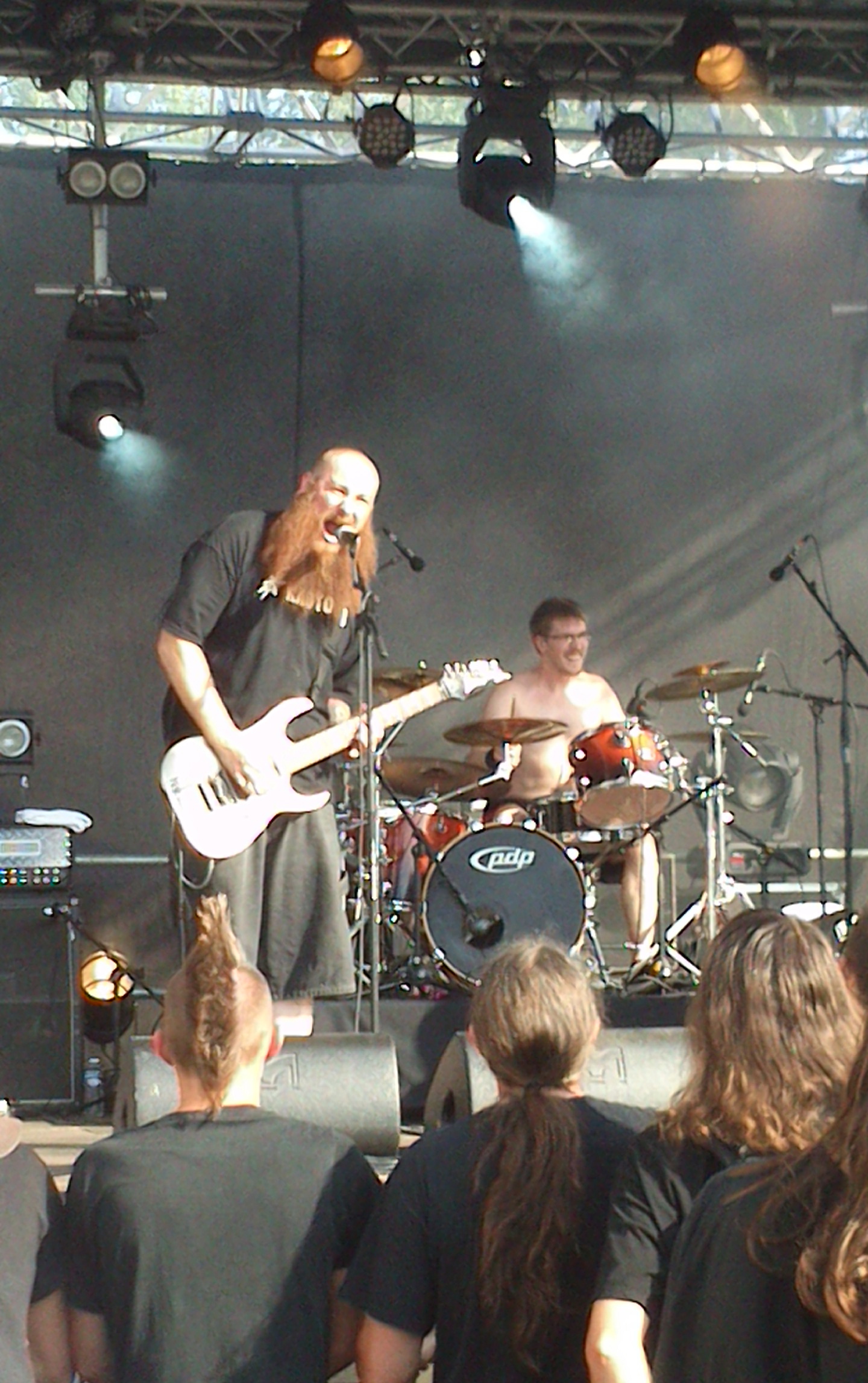 A 18h15 commençait le festival payant, sur une scène en plein air montée à côté de la Maison de la musique, laquelle est située peu avant l’entrée du parc de loisirs Cap’Découverte. Nolentia (Toulouse/Albi) ouvre le bal. Ou plutôt les hostilités. Les nuages ont disparu et les musiciens sont en plein soleil : des conditions extrêmes! J’attendais ce concert avec impatience car j’ai aimé leur dernier album paru cet année. Comme le laisse entendre leur slogan « Yes, we grind », Nolentia joue du grindcore gras et brutal, emmené par un guitariste / beugleur impressionnant par la taille, l’agressivité de son jeu (il doit en casser des cordes…), et sa voix d’ours. Le batteur envoie du bois (ce qui est la moindre des choses en matière de grind) et le bassiste crie dans les aigus, ce qui ajoute une bonne dynamique – même si je trouve ce chant moins convaincant que celui de son compère guitariste. Malheureusement le set sera perturbé par des problèmes techniques (coupures de son et casse). Pour autant le groupe, surmotivé, ne s’est pas laissé déstabiliser. Je pense qu’il n’est pas loin de rivaliser avec les références internationales du grind (Rotten Sound par exemple). Le festival commence bien! J’espère revoir un jour ce groupe dans de meilleures conditions.