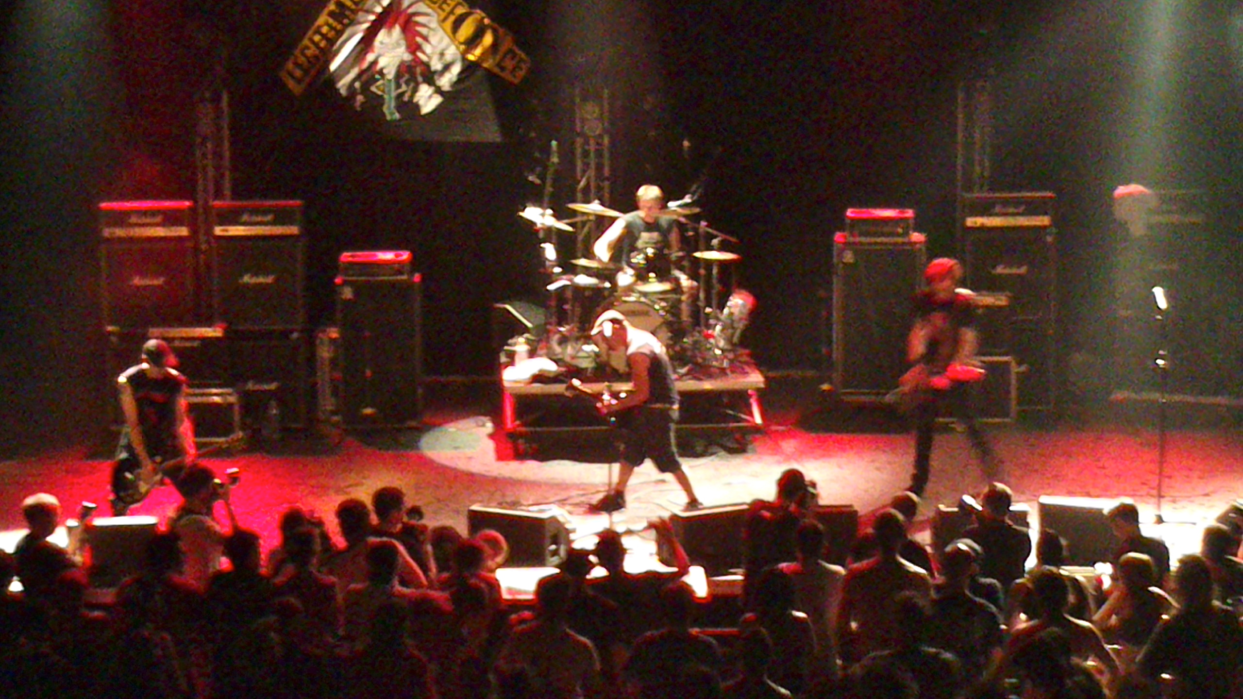 C’est Légitime Défonce (Toulouse) qui ouvre la « Main Stage » de la Maison de la musique. Et là c’est le choc : cette salle est excellente!!! Mais que fait une salle de cette qualité dans un endroit perdu comme celui-là? Pourquoi n’ai-je jamais entendu parler de cette salle auparavant? [je suis présent dans la région presque tous les week-ends] La salle dispose même d’un balcon, ce qui est un vrai plus. Bref tout le monde pouvait être rassuré : l’acoustique et la qualité du son seront au rendez-vous. Malheureusement, certains groupes s’obstinent à jouer trop fort pour une salle de cette dimension. Tout le monde ne sera pas d’accord avec moi, chacun à ses propres limites, mais en ce qui me concerne je n’aurai pas pu apprécier certains concerts à cause du volume sonore – ceci même avec des protections auditives. C’est un peu le cas, dans une moindre mesure, du show de Légitime Défonce. Je ne connaissais pas ce groupe punk « à la française » qui fait vivre le genre dans l’hexagone depuis les années 80. Ça fait plaisir de voir un peu de punk « à crêtes » car les punks « à roulettes » sont très bien représentés dans ce premier Xtreme Fest. « Keupon un jour, keupon toujours » comme diraient les Sales Maj’! Titres accrocheurs, énergie contagieuse : concert bien sympatoche! Cela aurait été encore mieux avec un son raisonnable.