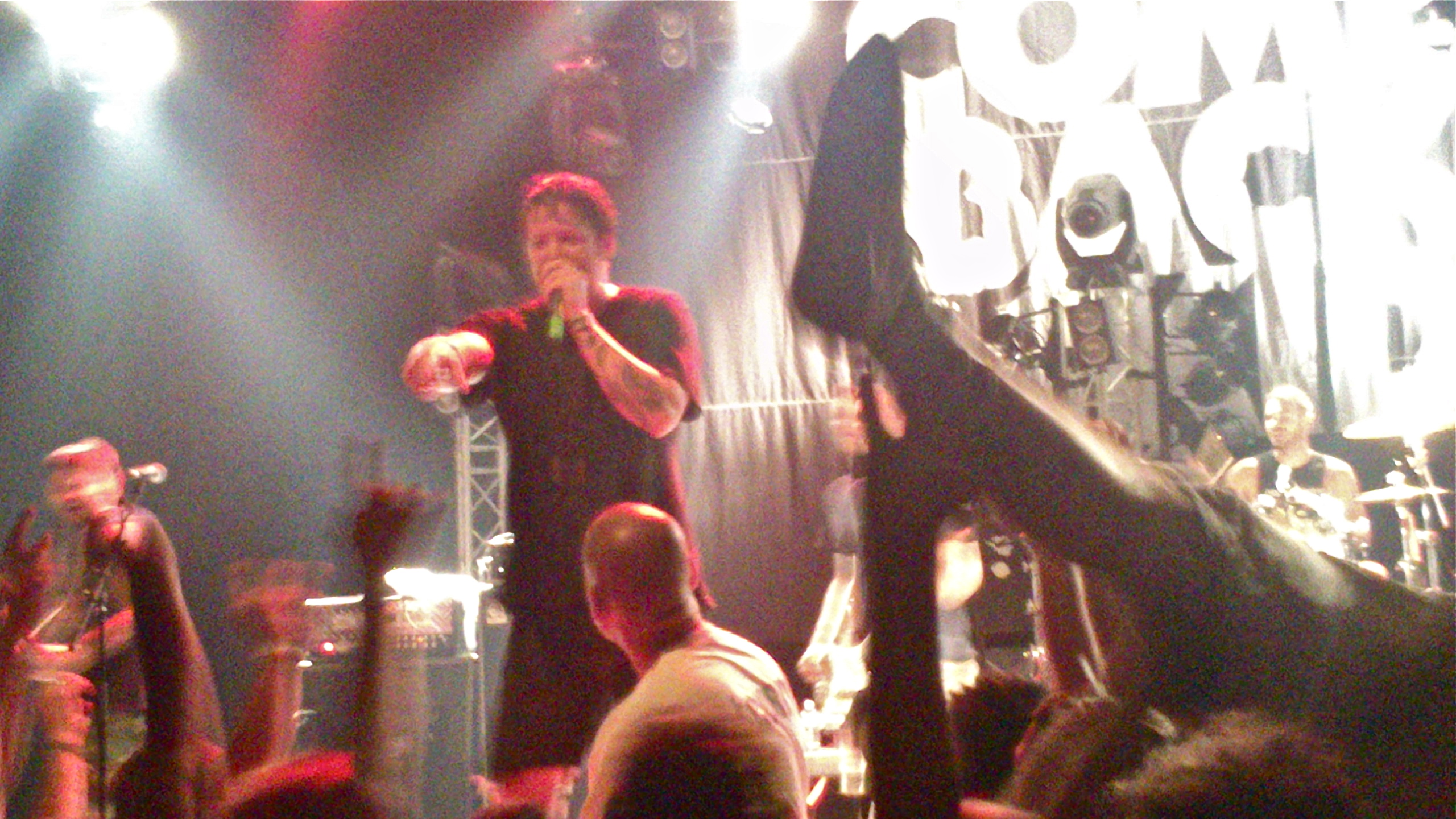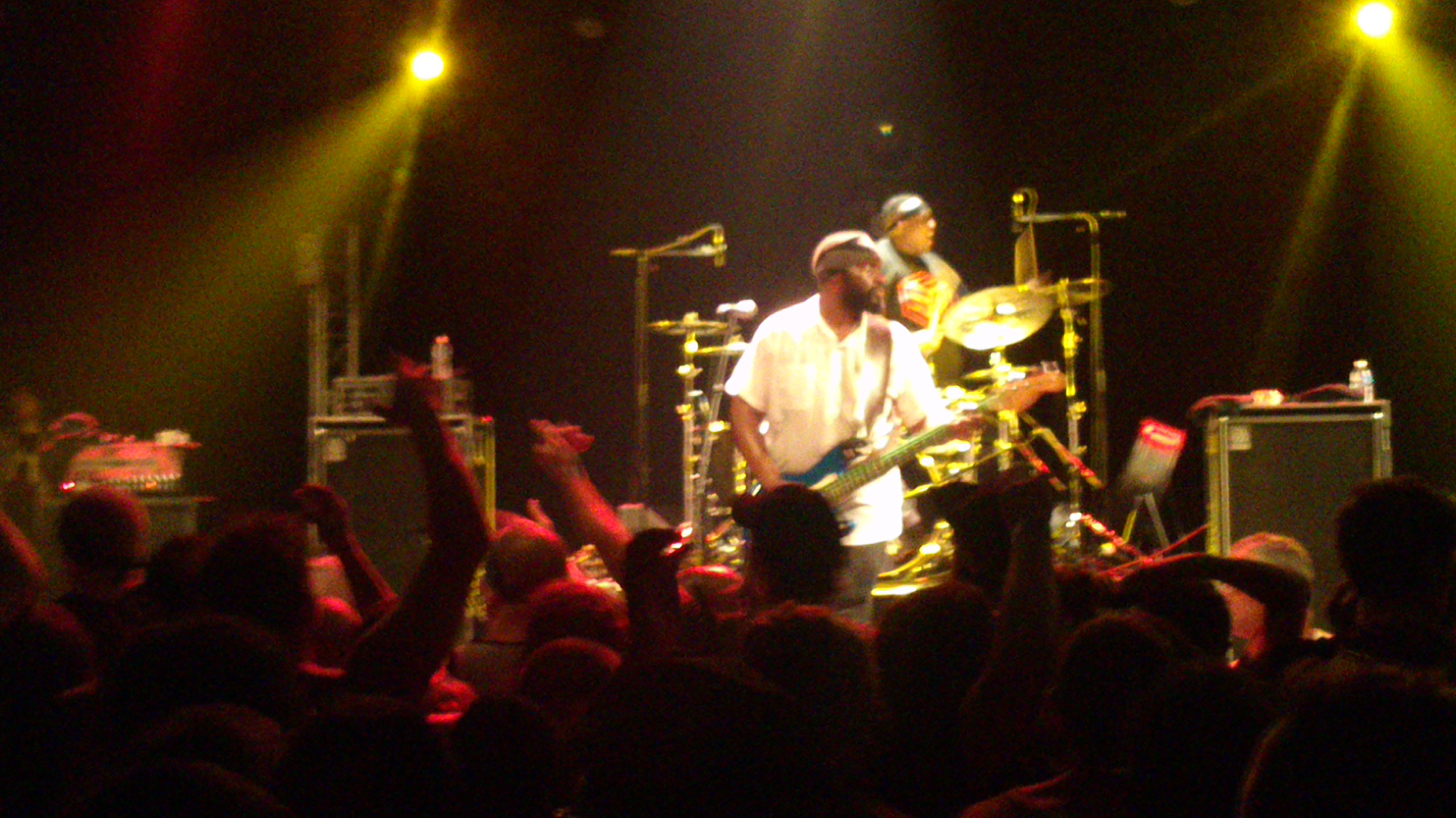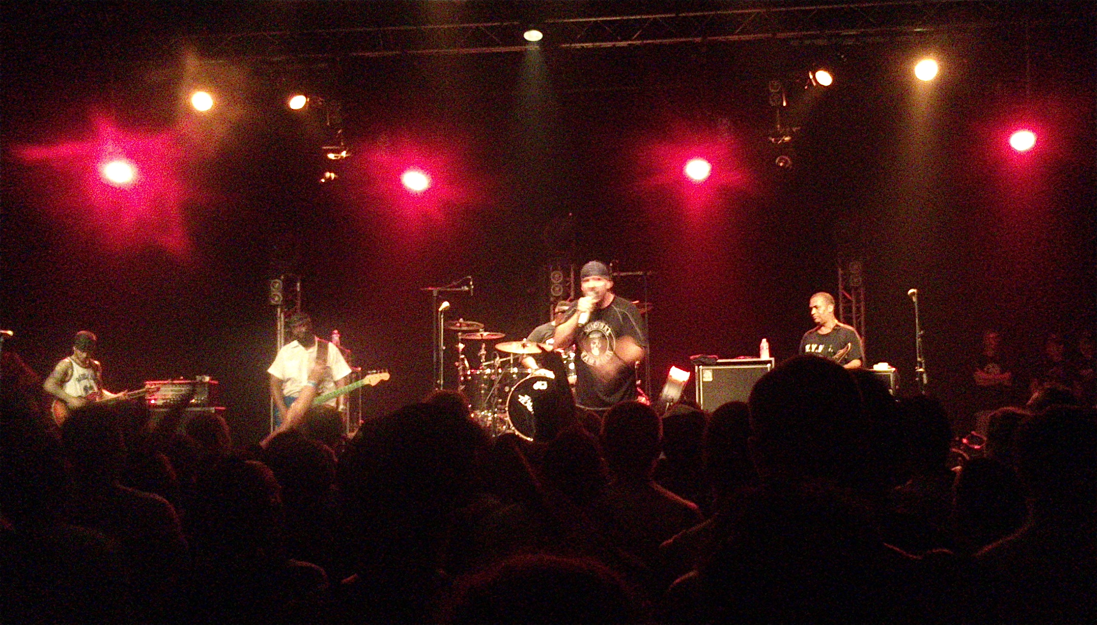 Intégré récemment dans la troupe, Tim « Rawbiz » Williams (ci-dessus) apporte à la basse une touche funk et semble à l’aise (participation aux choeurs notamment). Finalement c’est Mike que l’on voit le moins, souvent caché sur le côté gauche de la scène avant de surgir comme une balle. Et on l’entend pas beaucoup non plus, bien aidé par ses camarades choristes, sauf pour les discours entre deux morceaux. Mike, t’es bien gentil mais tu sais qu’on parle pas anglais en France? Enfin… il fait le show malgré tout et ç’est là l’essentiel. Les classiques défilent : Institutionalized, War Inside My Head, etc. Comme espéré le son est très bon, l’ambiance est démente, ça slame dans tous les sens… C’est le moment de dépenser l’énergie qu’il reste. Une spectatrice enlèvera même le haut, sous les clameurs de metalleux à qui ils n’en fallait pas tant. Bref c’est du grand n’imp’.