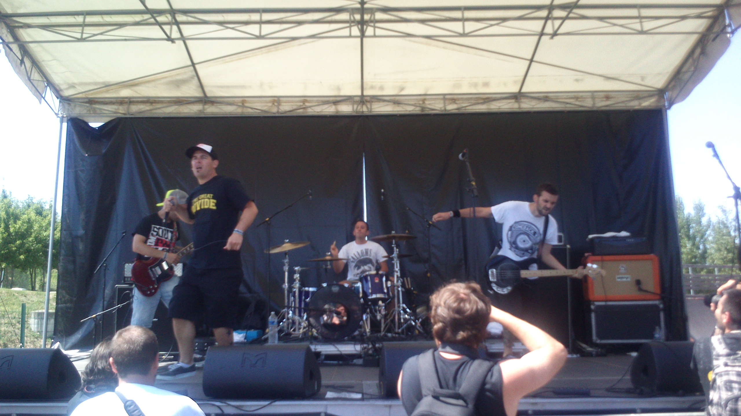 A 15h00 reprenaient les concerts gratuits du Skate Park, sous un soleil de plomb. Ça commence vite et fort avec This Life (Toulouse), qui pratique un punk-hardcore (hardcore old school disait-on à une époque). Franchement ça fait plaisir de voir que des groupes fassent perdurer ce genre. Il y a une relève (merci Comeback Kid). This Life m’a botté les fesses : très bon son, la pêche, morceaux accrocheurs et dansants (j’ai cru mourir de chaud), bonne maîtrise technique… Chapeau les gars, continuez! Apparemment ils ont bien l’intention de le faire, avec l’enregistrement d’un album à le rentrée.