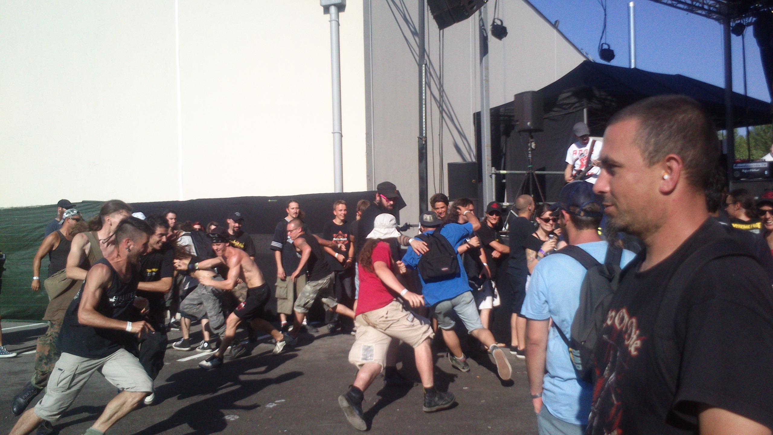 Quelques mots sur les pratiques des festivaliers (ci-dessus un mini circle pit). Le karate dance style semble être en net recul lors des concerts de metalcore (Hatebreed ou Stride Against Lies), à moins que cela ne s’explique par le manque d’espace (dans la Maison de la musique en particulier) et le métissage du Xtreme Fest. Ça a beau être spectaculaire, je ne vais pas être nostalgique. A l’inverse, le circle pit a la cote : cette danse est presque devenue un rituel obligatoire. Personnellement je trouve qu’un circle pit de temps en temps c’est sympa, toutes les 10 minutes en revanche ça gave un peu. Concernant les looks, des évolutions également. Les grands gagnants sont : la casquette à visière relevée, les chaussettes remontées, et bien sûr… le bandana! Guère étonnant alors que Municipal Waste et Suicidal Tendencies sont à l’affiche.