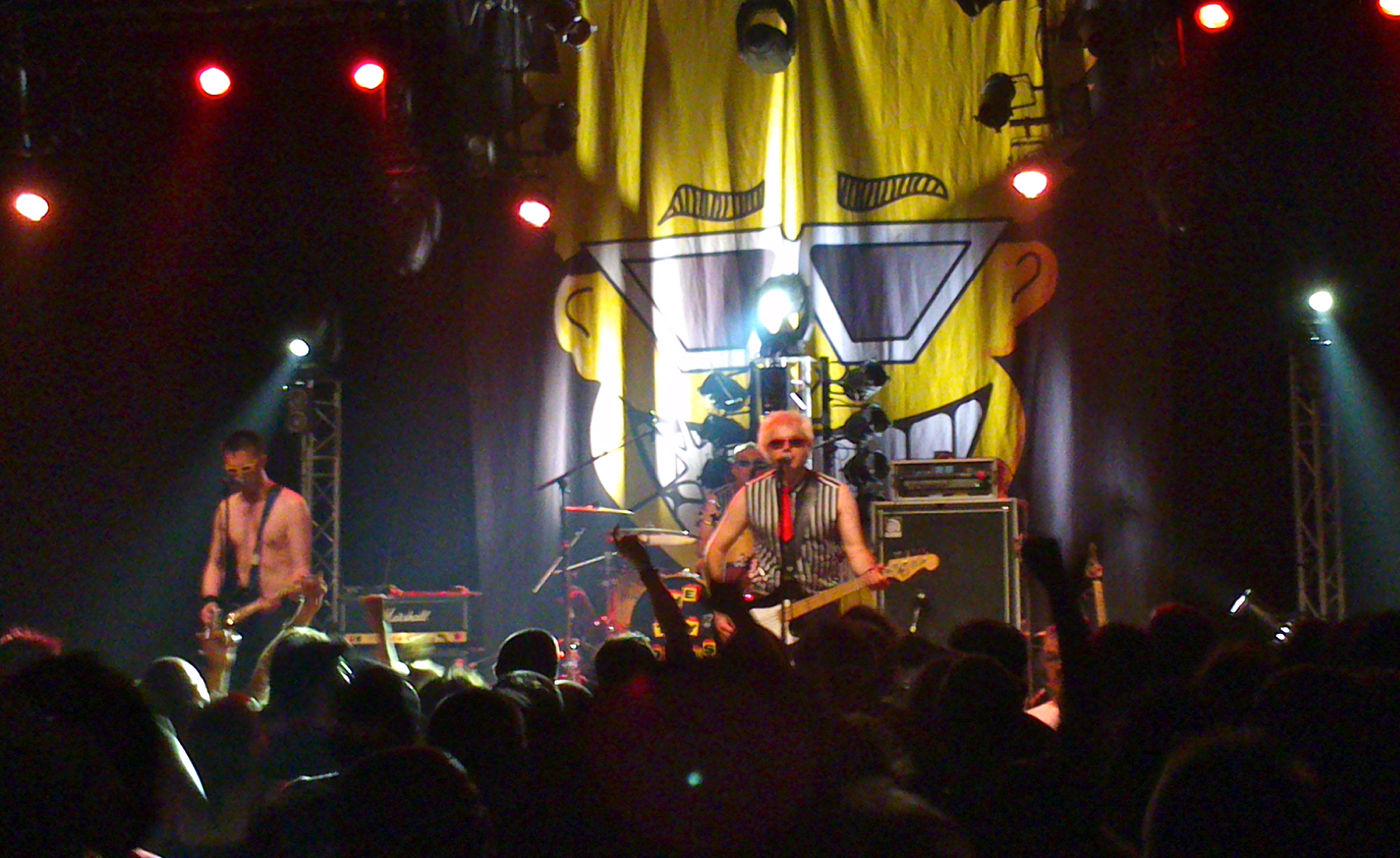 Comme dirait Nostalgie : place à la légende. Une légende pour beaucoup de spectateurs au vu de l’impatience du public! Pour ma part je ne connaissais pas les Toy Dolls (UK) (flagellation n°1), groupe punk anglais formé en 1979. Autour de Michael « Olga » Algar (seul membre d’origine), ces drôles de poupées ont une forte personnalité, bâtie autour d’hymnes joyeux et enfantins, ainsi que d’étranges solos de guitare. La voix d’Olga nous rappelle qu’il s’agit bien de punk anglais. L’ambiance est au joyeux pogo, néanmoins difficile à supporter pour un couple d’anglais fans de la première heure ayant dépassé la cinquantaine. Un bon moment. Je demande à revoir ce groupe après m’être approprié leurs tubes.