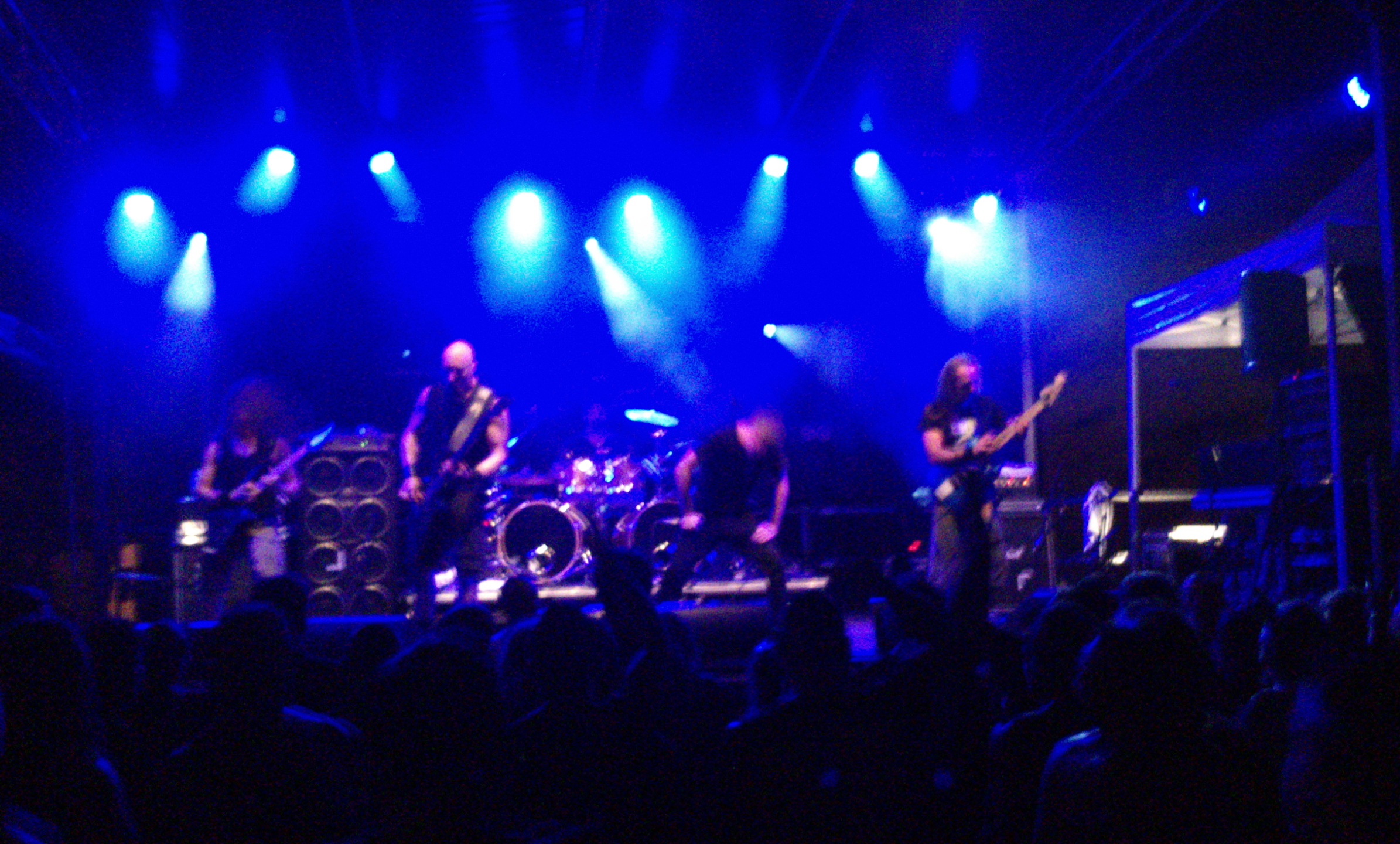 Les choses très sérieuses commencent avec Municipal Waste (USA). Ce groupe est un véritable phénomène, remettant au goût du jour depuis quelques années un crossover typiquement années 80 (thrash metal + hardcore + bandana). Il a en partie acquis sa popularité grâce à ses prestations scéniques. J’avais déjà aimé lors du Hellfest 2008 (en plein air), mais cette fois j’ai carrément adoré! Fun par excellence, la musique de Municipal Waste est taillée pour la scène, en particulier les circle pit (je crois avoir battu largement mon record de participations) et le mosh! Les riffs thrash sont excellents, le rythme d’enfer, les morceaux s’enchaînent, les passages typiquement hardcore permettent de varier les plaisirs (danse NY style, les néophytes se reporteront au fameux clip Step Down de Sick Of It All), les choeurs déchirent.